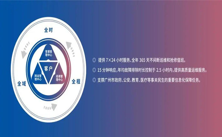 广宽公司深耕网络传输、云服务、智慧城市等多个领域二十余年,参与了广州市公安云、教育云、医疗云、交通云等40多个大型专网系统的建设运营。依托覆盖全市11个区85%以上区域自有城域网资源、高等级数据中心和云计算团队,广宽公司不断精进专业技术水平,提高产品和服务质量,创新构建由客服管理中心、网运管理中心、巡维管理中心组成的全时全域全程“三维立体”...