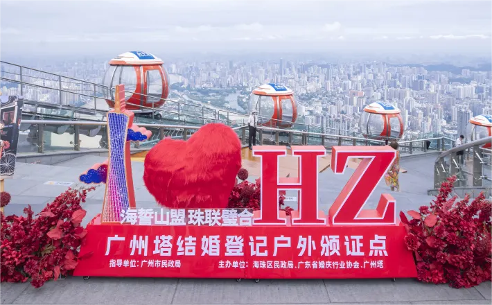 5月22日,广州市城市建设投资集团有限公司下属广州塔公司携手海珠区民政局、广东省婚庆行业协会,在广州塔塔顶450观景平台举办“爱在云端”——全国最高结婚登记户外颁证点授牌仪式,广州塔正式成为海珠区特色结婚登记户外颁证点。