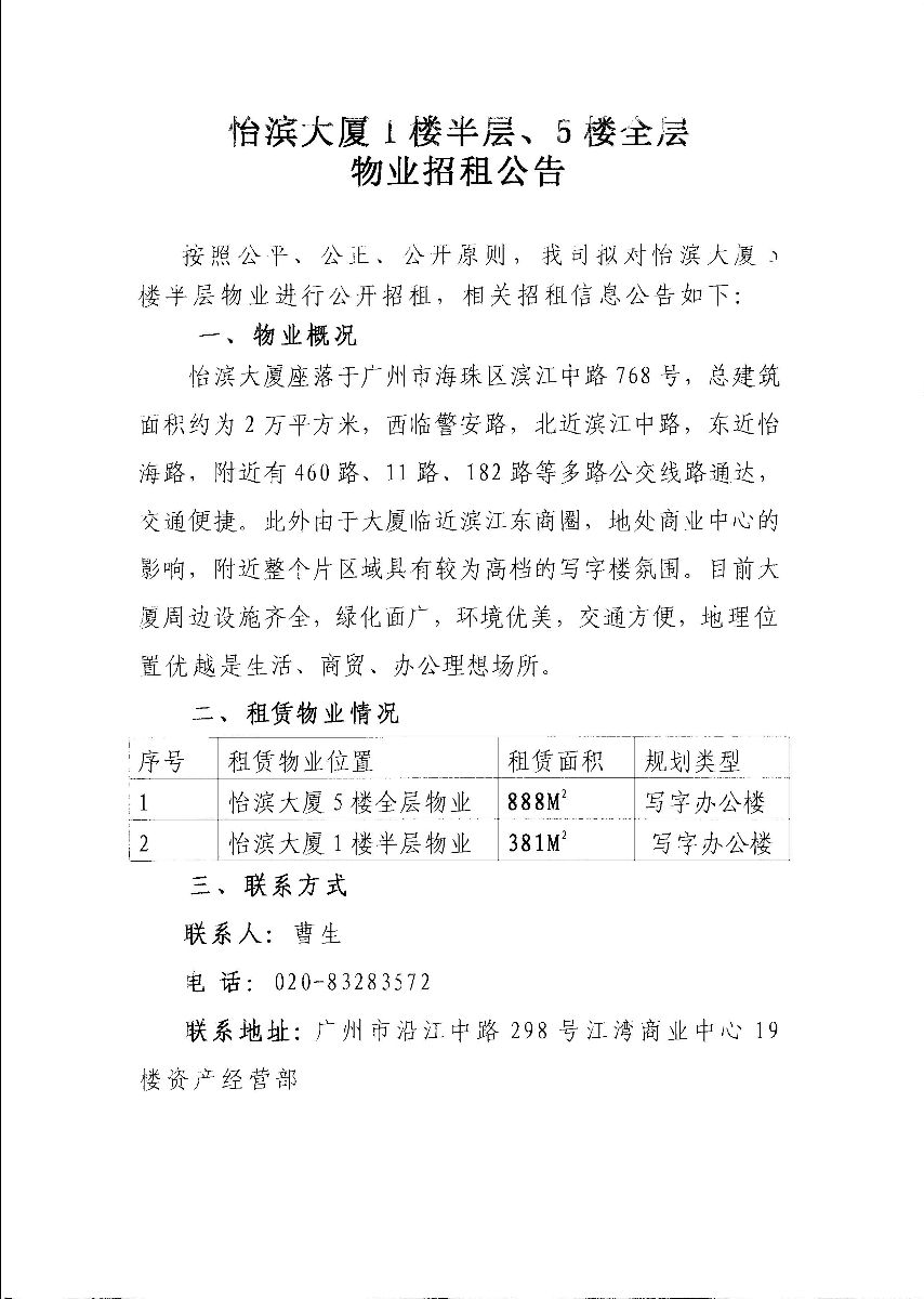 宜滨大厦1楼半层、5楼全层物业招租公告