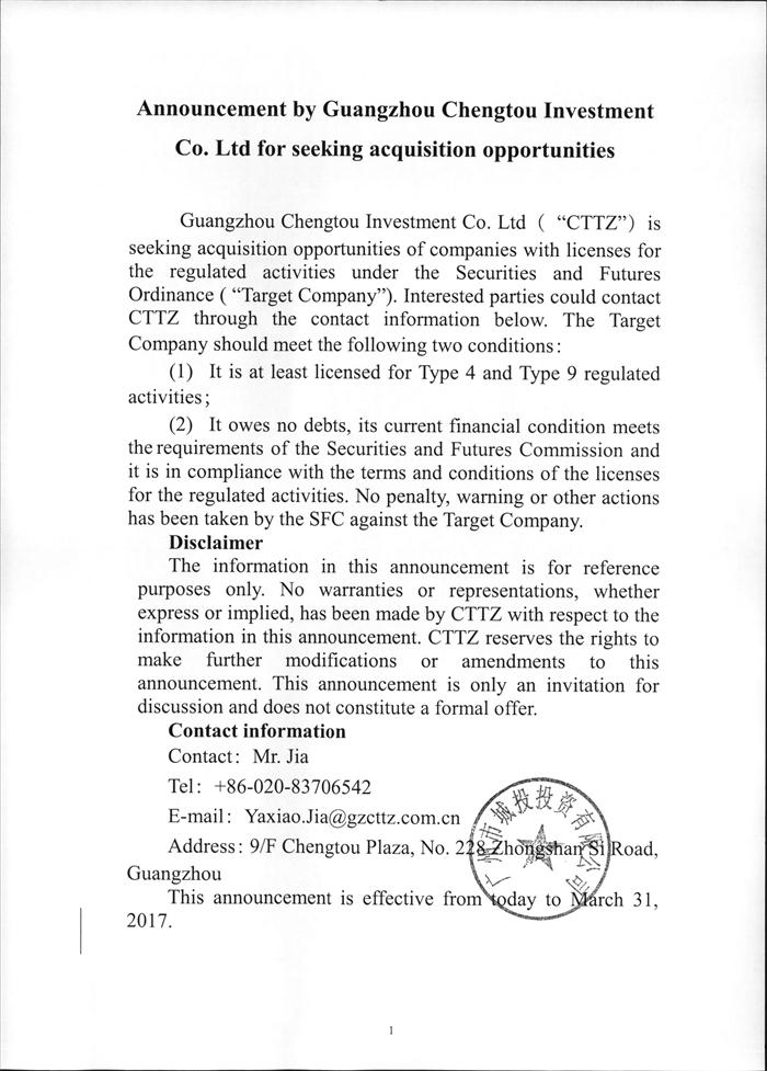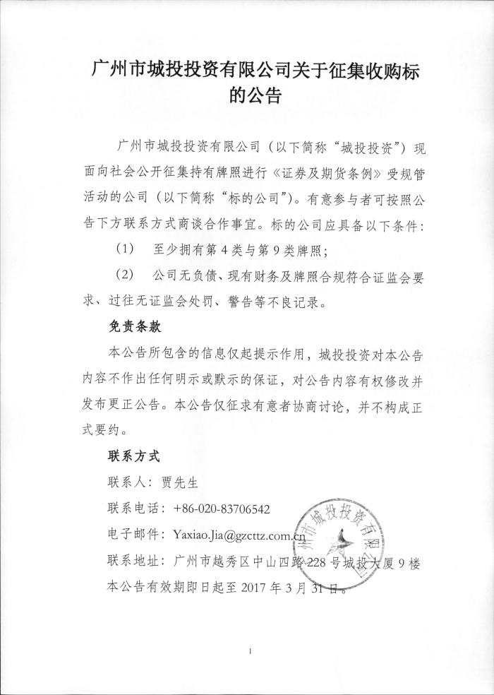 广州市城投投资有限公司关于征集收购标的公告