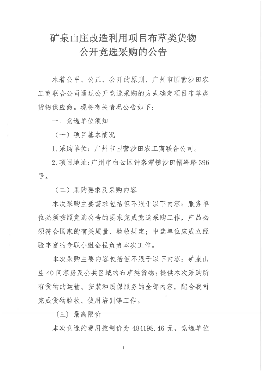 矿泉山庄改造利用项目布草类货物公开竞选采购的公告