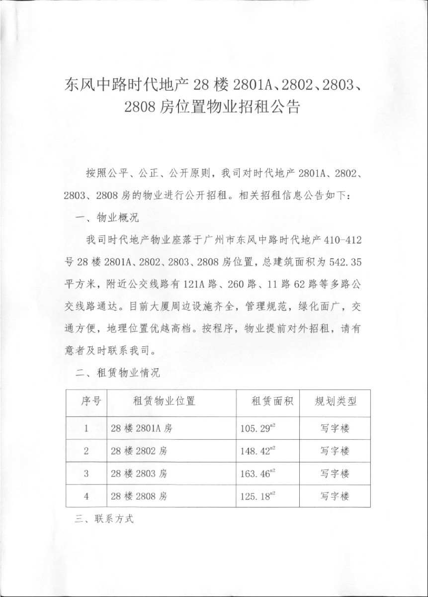 时代地产28楼2801A、2802、2803、2808房物业招租公告