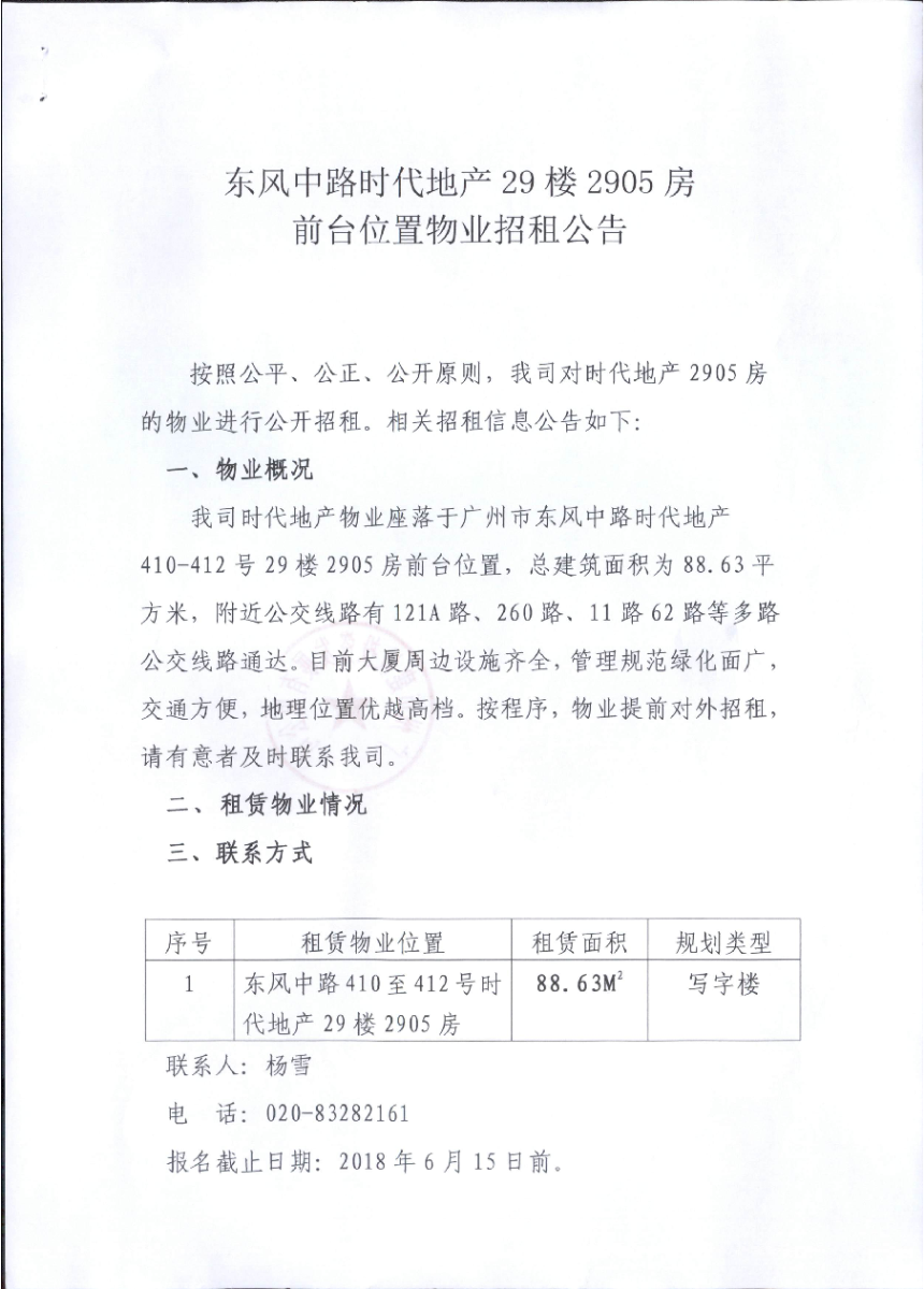 时代地产29楼2905房物业招租公告