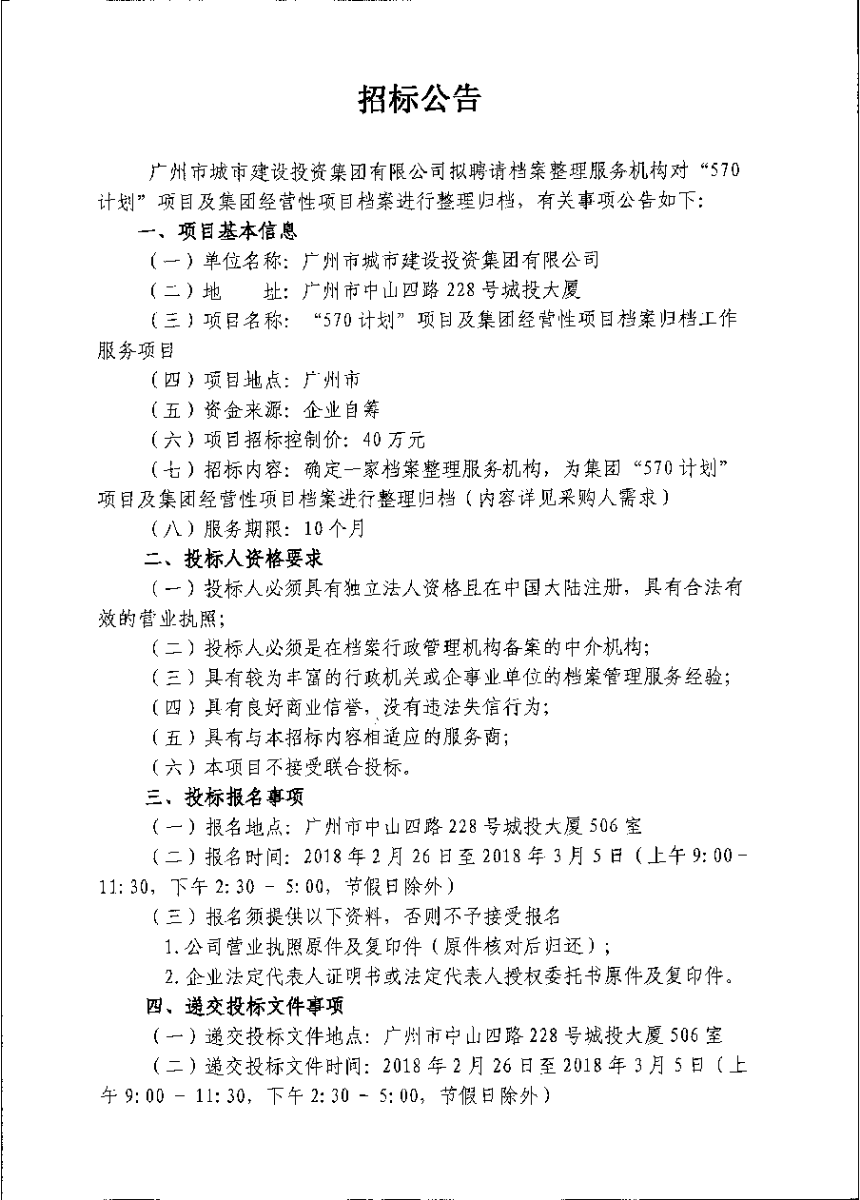 "570"计划项目和集团经营性项目档案归档工作服务项目招标公告