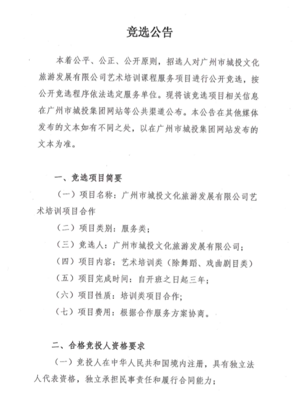 广州市城投文化旅游发展有限公司艺术培训项目合作