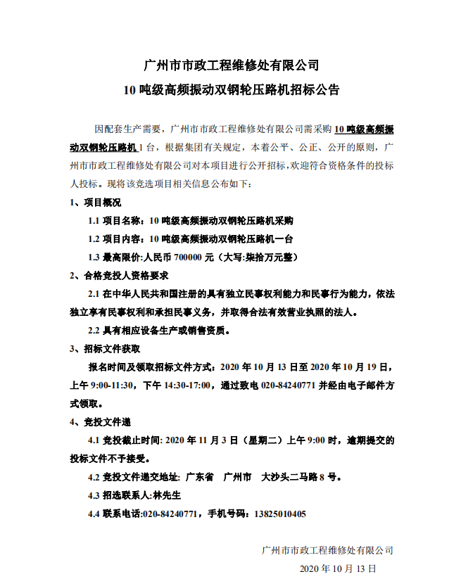 广州市市政工程维修处有限公司10吨级高频振动双钢轮压路机招标公告